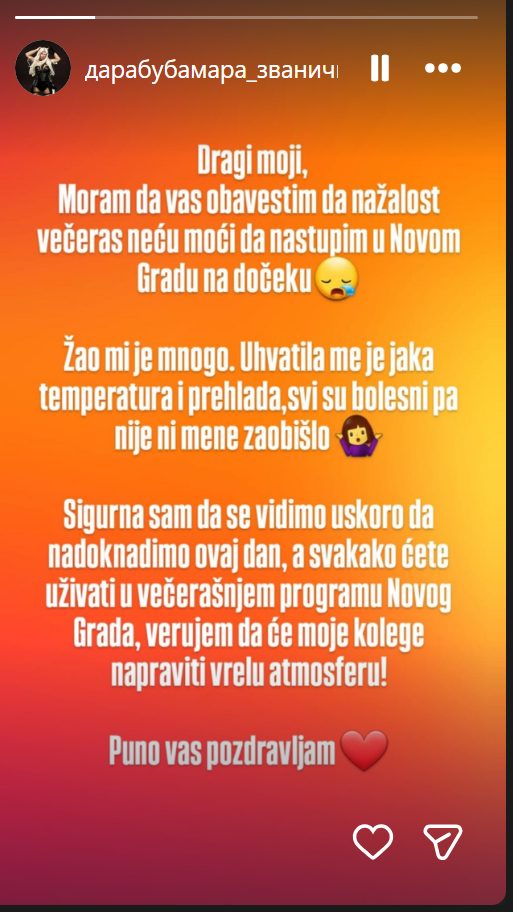 - Dragi moji, moram da vas obavestim da, nažalost, večeras neću moći da nastupim u Novom Gradu na dočeku. Žao mi je mnogo. Uhvatila me je jaka temperatura i prehlada, svi su bolesni pa ni mene nije zaobišlo. Sigurna sam da se vidimo uskoro da nadoknadimo ovaj dan, a svakako ćete uživati u večerašnjem programu Nogo Grada , verujem da će moje kolege napraviti vrelu atmosferu - napisala je Dara na Instagramu.