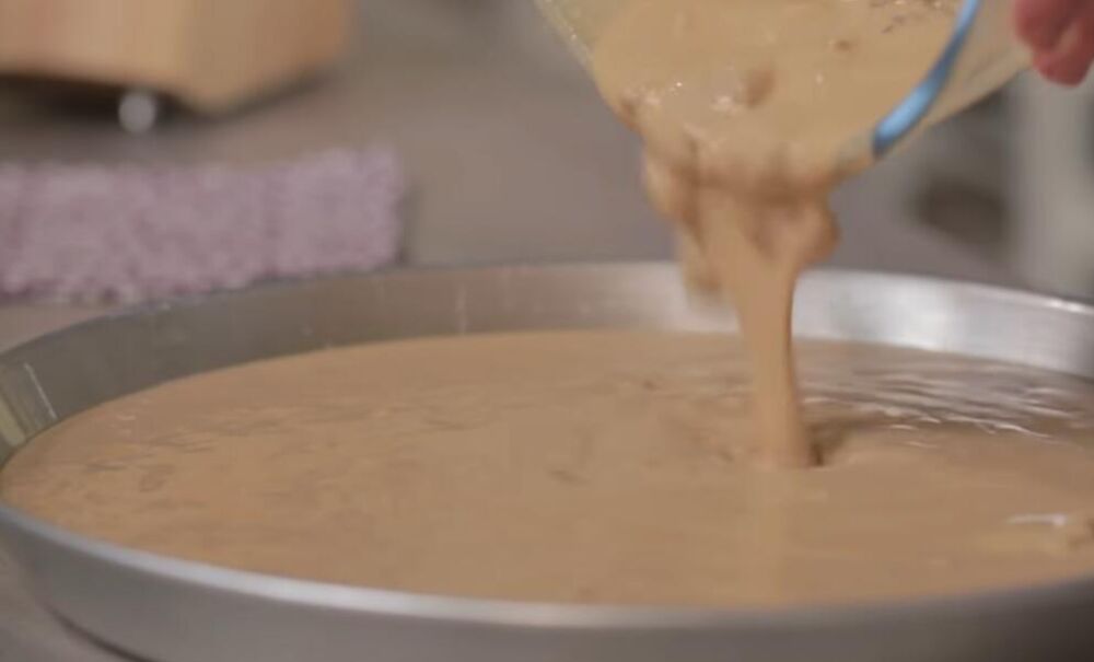 Kad smesa postane homogena, umešajte med i so, pa dodajte orašasta plodove, a malo orašastih plodova ostavite sa strane za posipanje. Smesu izlijte u okrugao podmazan kalup u koji ste stavili papir za pečenje.