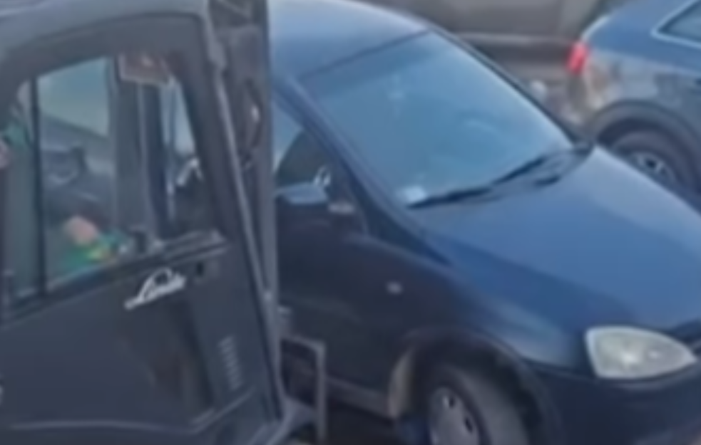 Pojavio se i viljuškar koji je spasio stvar. On je podigao "opel korsu" i pomerio vozilo, kako bi oslobodio prolaz ženi u "audiju".