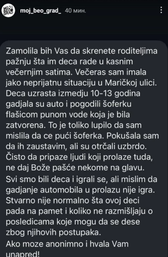 - Zamolila bih vas da skrenete roditeljima pažnju šta im deca rade u kasnim večernjim satima. Večeras sam imala jako neprijatnu situaciju u Maričkoj ulici. Deca uzrasta između 10 i 13 godina gađala su auto i pogodili šoferku flašicom punom vode koja je bila zatvorena. To je toliko lupilo da sam mislila da će pući šoferka. Pokušala sam da ih zaustavim, ali su otrčali uzbrdo. Čisto da pripaze ljudi koji prolaze tuda, ne daj Bože pašće nekome na glavu. Svi smo bili deca i igrali se, ali mislim da gađanje automobila u prolazu nije igra. Stvarno nije normalno šta ovoj deci pada na pamet i koliko ne razmišljaju o posledicama koje mogu da se dese zbog njihovih postupaka - piše u prvoj objavi.