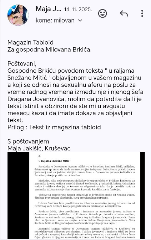 I dok se strane službe bave Gašićem, jedan javni tužilac OJT -a se bavi dešavanjima u Kruševačkom pravosuđu pa je tako snimak razgovora između Dragana Jovanovića i tužioca Milana Mihajlovića iz Brusa kako planiraju tok NEZAKONITOG suđenja Maji Jakišić dostavio medijskom portalu, jer kako kaže javni tužilac koji nije želeo da mu se ime pominje javno "u Draganovoj kancelariji i olovka snima ako ste dovoljno vešti da je ostavite da snima "