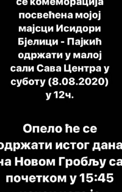 - Dragi prijatelji, ovim putem vas obaveštavam da će se komemoracija mojoj majci Isidori Bjelici - Pajkić održati u maloj sali Sava Centra u subotu u 12 časova. Opelo će se održati istog dana na Novom groblju s početkom u 15:45 časova, nakon čeega je kremacija u 16:15 časova - obavestio je Lav pratioce na Instagramu.