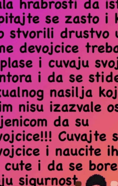 - Milena Radulović je samo jedna od velikog broja onih koje su prošle kroz predatorske ruke, a imala hrabrosti da istupi. Zapitajte se zašto i kako smo stvorili društvo u kome devojčice treba da se plaše svojih mentora i da se stide s*ksualnog nasilja koje nisu ničim izazvale, osim činjenicom da su devojčice. Čuvajte svoje devojčice i naučite ih da ne ćute i da se bore za svoju sigurnost - poručila je Goca.