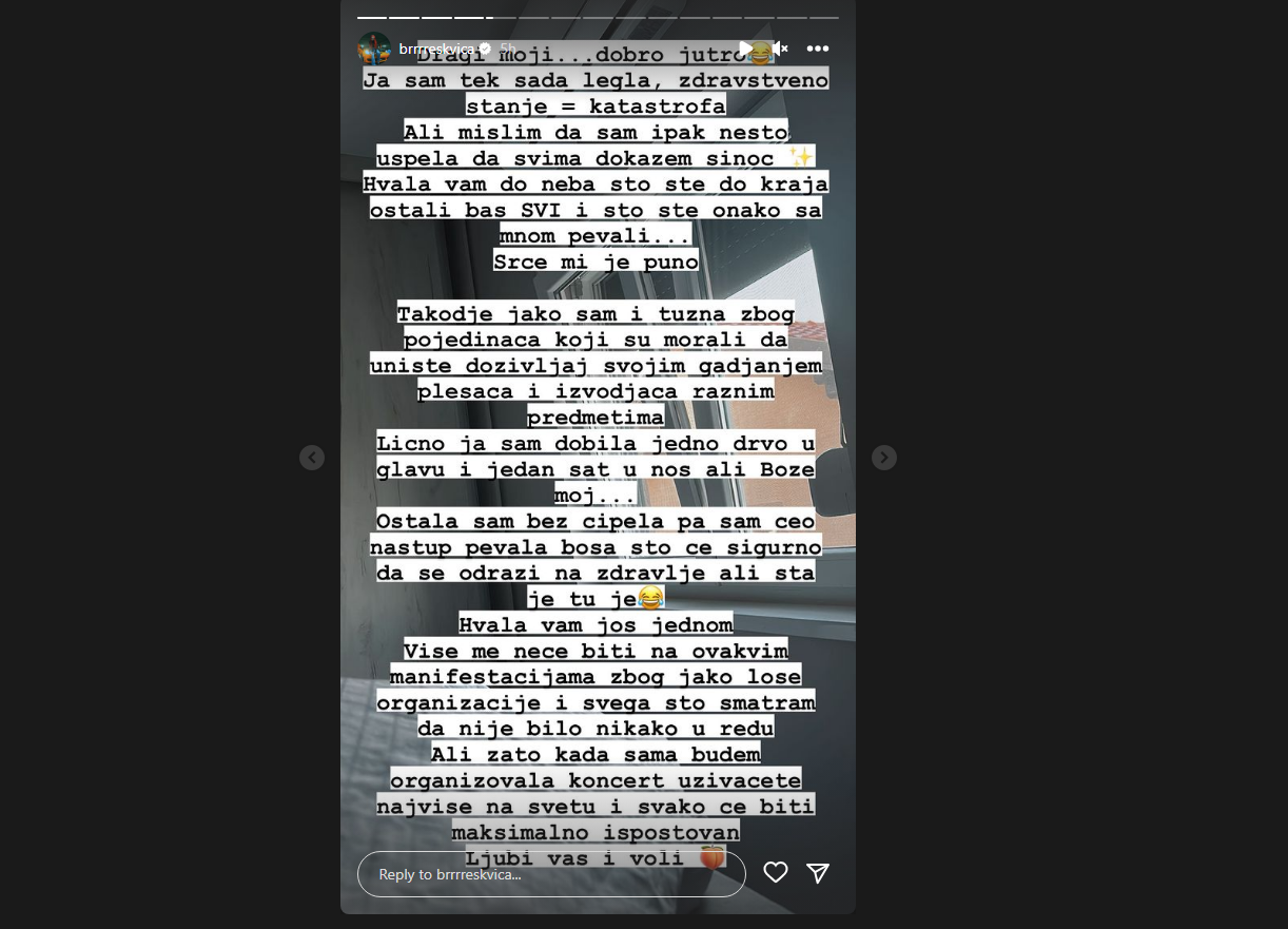 Pevačica je obavestila svoje pratioce da se ne oseća najbolje i detaljno opisala šta se sve dogodilo za vreme njenog nastupa.