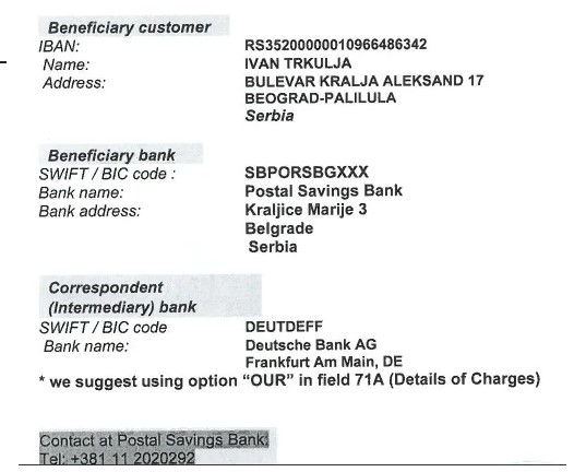 Žiro račun 200-112280189-06 – Poštanska štedionica, Ivan Trkulja, Beograd ul.Bulevar Kralja Aleksandra br.17/12
