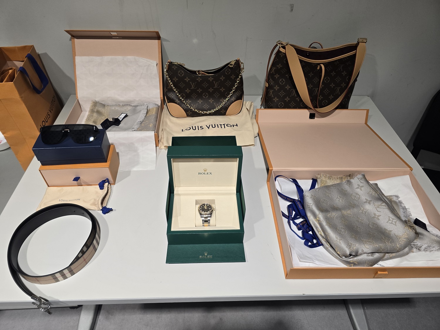 Detaljnom kontrolom su u prtljagu putnika pronađeni ručni časovnik roleks’’, dve ženske tašne, dve ešarpe i naočare za sunce robne marke Louis Vuitton i ženski kaiš burberry.