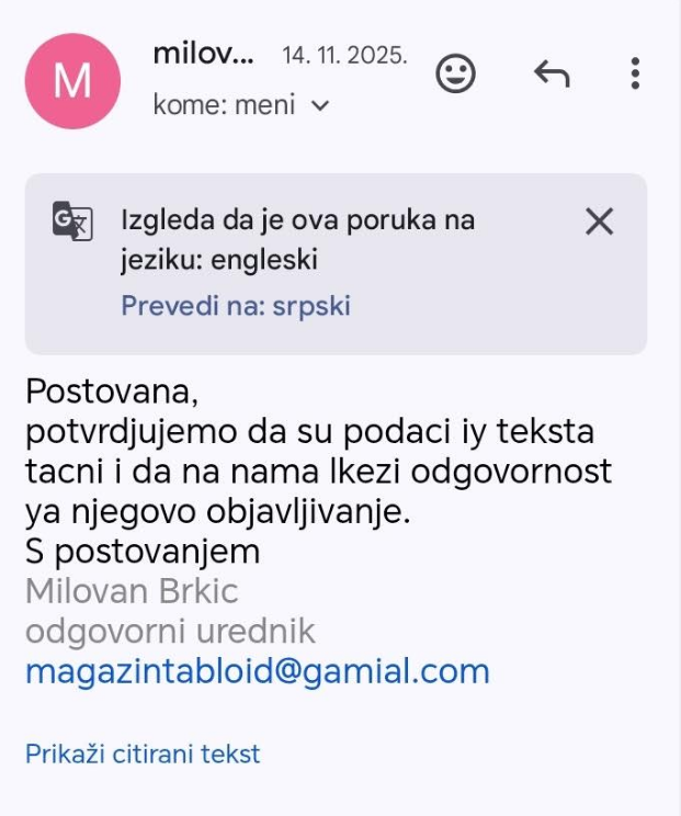 možda sudija Milivoje Dimitrijević pozove da svedoči urednik magazina tabloid jer je to vrlo bitna činjenica s obzirom da se u optužnom predlogu pominje " Zašto visoki savet tužilaštva neće da reaguju po pitanju sexualne afere na poslu Dragana i njegove ljubavnice " , a gde je vlasnik tabloida Maji poslao dopis u kojem jasno piše da Maja nije autor tog teksta i da odgovarnost za taj tekst snosi redakcija koja je autor, takođe glavni urednik i navodi da je tekst istinit a koji obavljajemo u celosti.