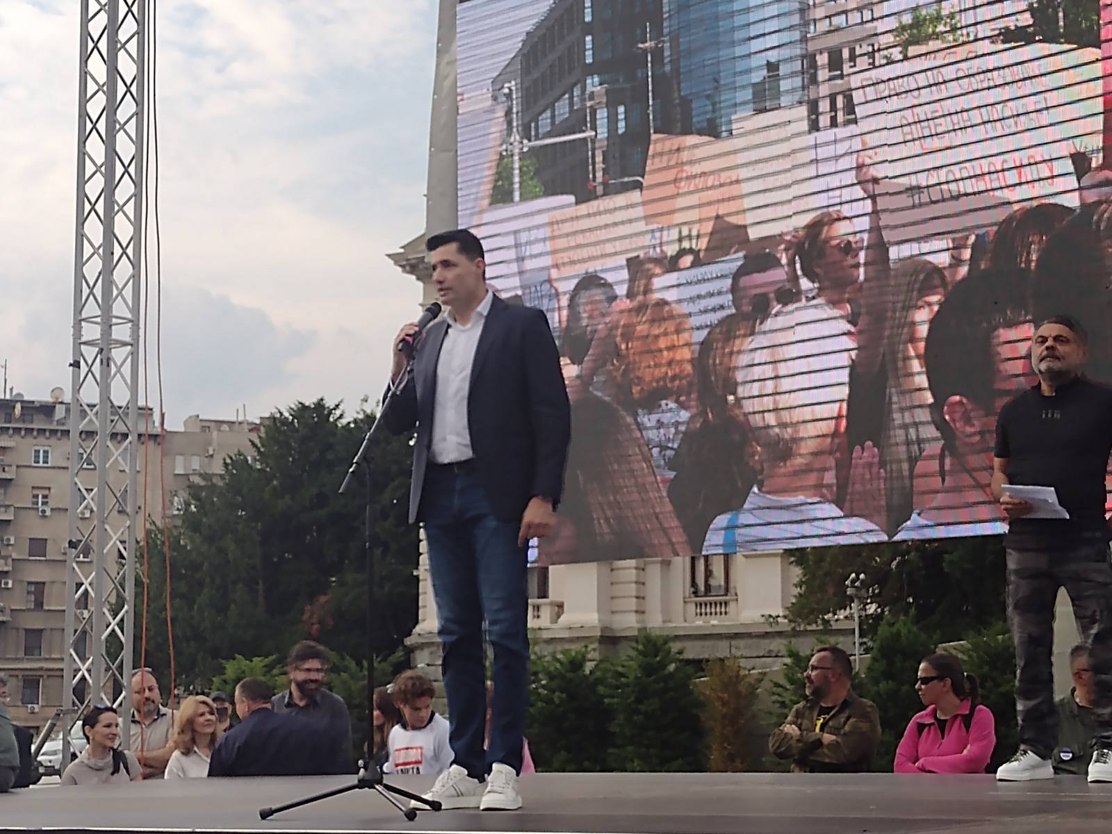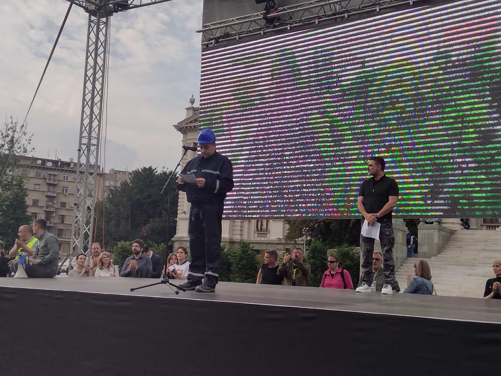 "Umesto da prenose koliko nas je ovde, zbog čega nas ne emituju? Zato što nas se plaše, znaju da smo mi pretnja ovom vladajućem režimu. Jesmo li izdajnici ako želimo Srbiju gde se ne neguje kultura nasilja, nego kultura dijaloga? Naravno da nismo", kaže on.