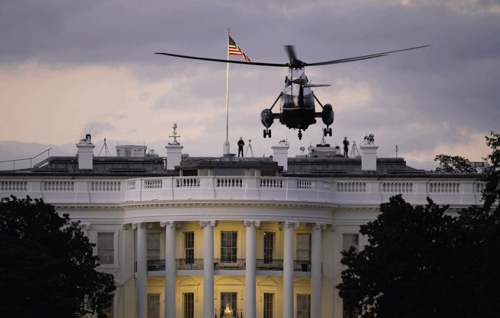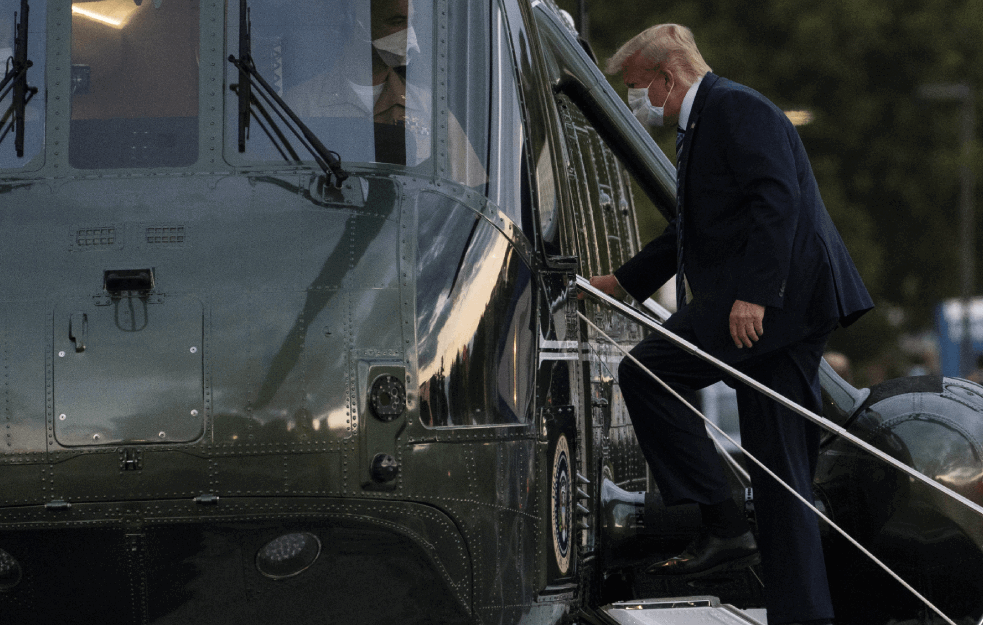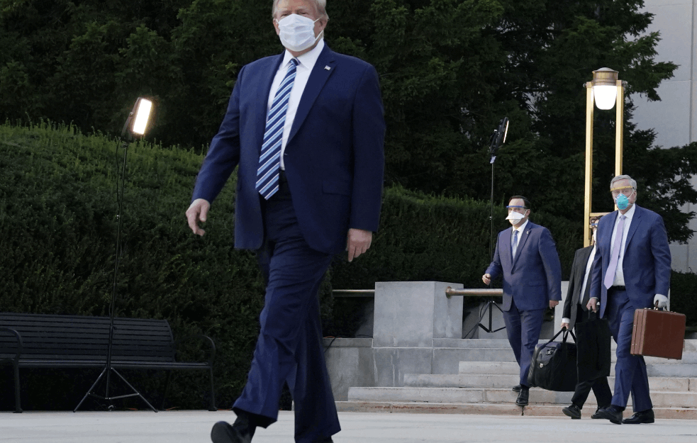 Tramp je sa maskom na licu i podignutom pesnicom izašao iz Nacionalnog vojnog medicinskog centra "Volter Rid" i ušao u terenac, koji ga je odvezao do vojnog aerodroma na kratki let nazad do Bele kuće.