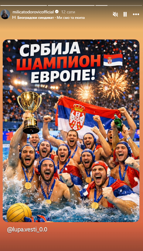 Milica je na Instagramu istakla da puca od ponosa nakon što su srpski vaterpolisti osvojili evropsko zlato.