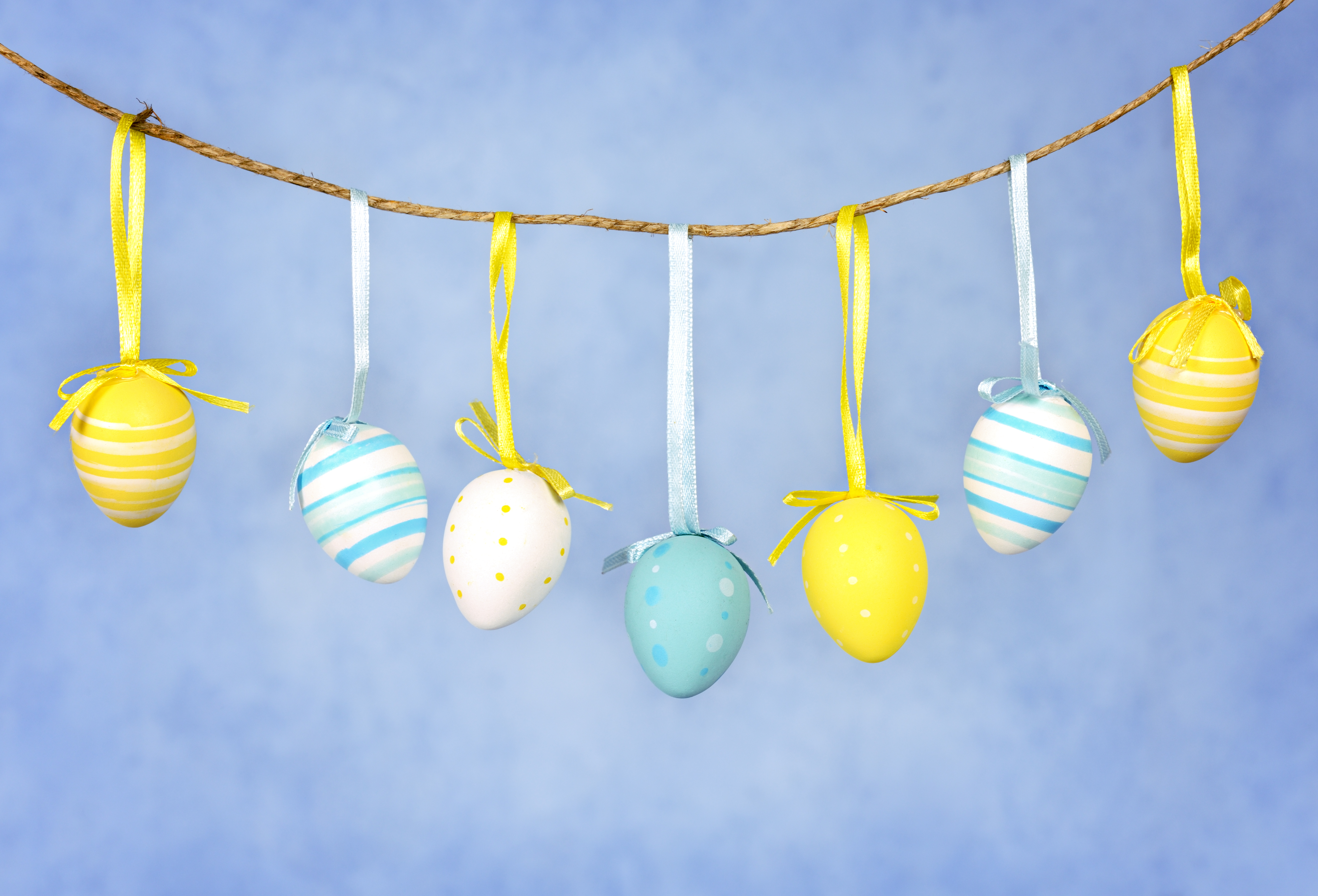Napravite dekorativna jaja od stiropora, a zatim ih dekorišite. Ulepšajte ih trakom, a zatim okačite uskršnja jaja na različite visine i zavežite ih zajedno. Zakačite ih na plafon ili zid kako biste dobili lep uskršnji ukras.
